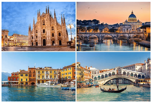 Իտալիան բազմաթիվ գոհարների տուն է, որոնք պարզապես ապշեցնում են ցանկացած զբոսաշրջիկի: Իտալիայի հպարտանալու հիմնական գրավականը շքեղ քաղաքներն են, սկսած հիանալի մշակութային մետրոպոլիաներից, ինչպիսիք են.