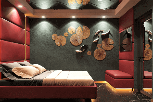 Մեկ այլ ննջասենյակի ձևավորում, չնայած այստեղ կարմիր պաստառապատ պատերը թողնում են կաշվի տպավորություն: Ոսկեգույն ժապավենը, որը ունի ուղղահայաց դիրք, ավելի ընդգծում և արտահայտիչ է դարձնում կարմիրը: