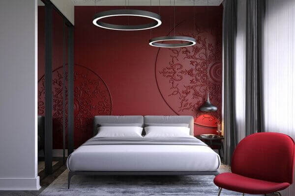 Կառուցեք մուգ կարմիր շեշտադրում ունեցող պատ: Գեղեցիկ դաջվածք ունեցող գեղարվեստական պատը իր խորը կարմիր երանգը տալիս է պատուհանի առջև գտնվող ննջասենյակի աթոռին, որտեղ այն կարող է շրջանակված լինել մաքուր սպիտակ պաստառներով կամ վարագույրով: Ուշադրություն դարձրեք նաև, թե ինչպես են առաստաղի երկու լույսերը վերարտադրում նաև պատի շրջանաձև օղակները և ավելացնում ննջասենյակի ներդաշնակությունը: