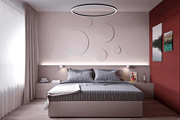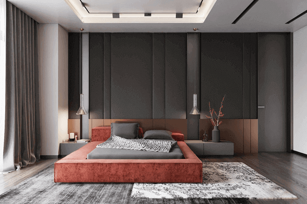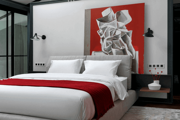Մոխրագույն ննջասենյակին կարմիրի միջոցով ավելացրեք գրավիտացիայի էֆֆեկտ: