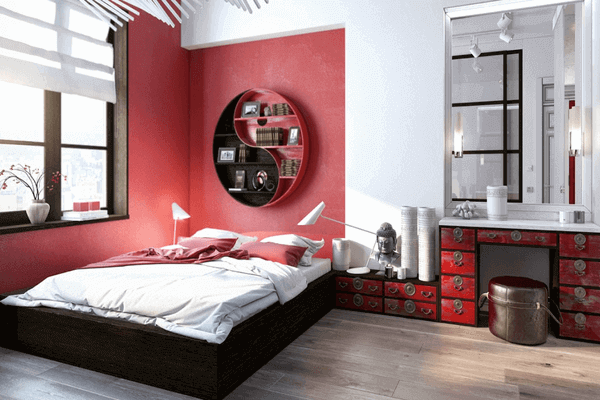 Եթե ձեր ննջասենյակը ունի համեմատաբար մեծ չափեր, կարմիր գույնը ձեզ կօգնի այն լավագույնս հաճելի դարձնել: Մահճակալի շուրջը օգտագործելով կարմիր գույնը, դուք լայն ննջասենյակում ձեզ կզգաք առանձնացված և հարմարավետ: Ուշադրություն դարձրեք նաև, թե որքան գեղեցիկ ու ներդաշնակ են սև-կարմիր ԻՆ և Յան ստելաժի և մահճակալի գույները: