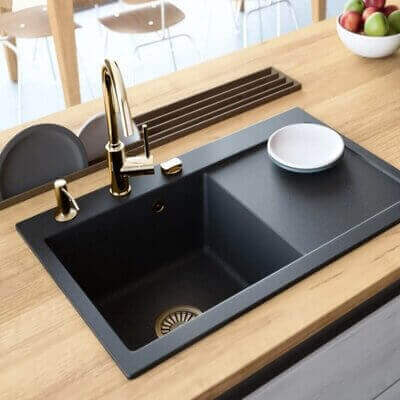 • արդյունավետ դիզայն: Խոհանոցի մնացած սանտեխնիկան և բաց գույնի հարդարումը ունենում է վառ շեշտադրում: Սև լվացարանը գերժամանակակից և թանկ տեսք ունի: Ամենից հաճախ այն գեղեցիկ է փայտի մուգ երանգներով, ավելի քիչ՝ բաց գույներով։ Փայտի լաքապատ մակերեսը ներդաշնակ է փայլեցված քարե լվացարանին` աներևակայելի տպավորիչ և գրավիչ տեսքով,